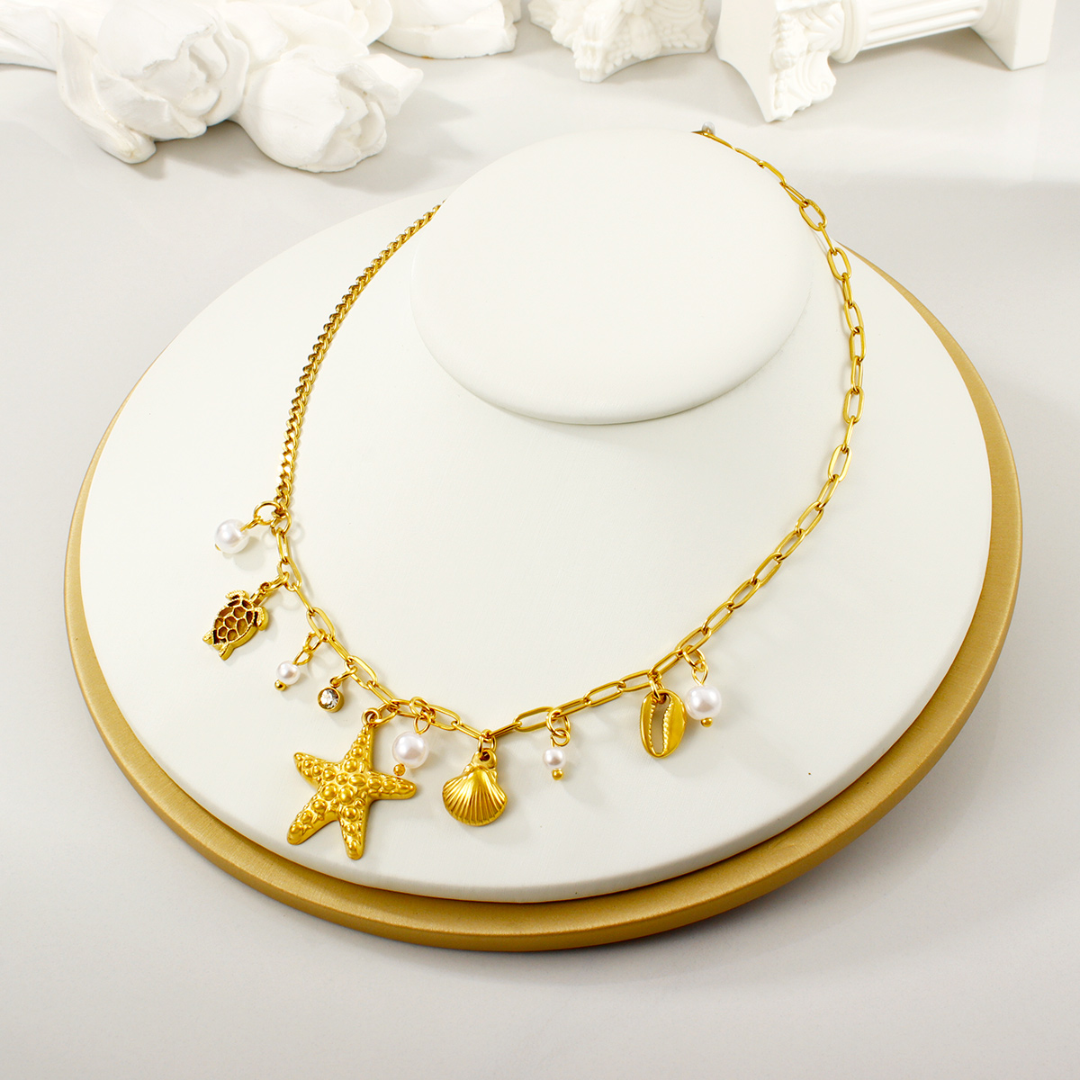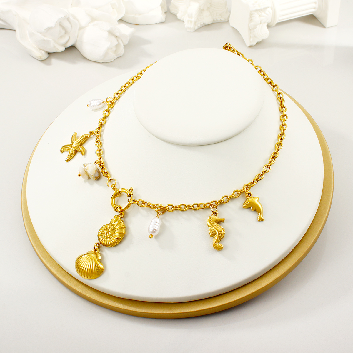 时尚18K镀金不锈钢太阳贝壳陶瓷鱼项链