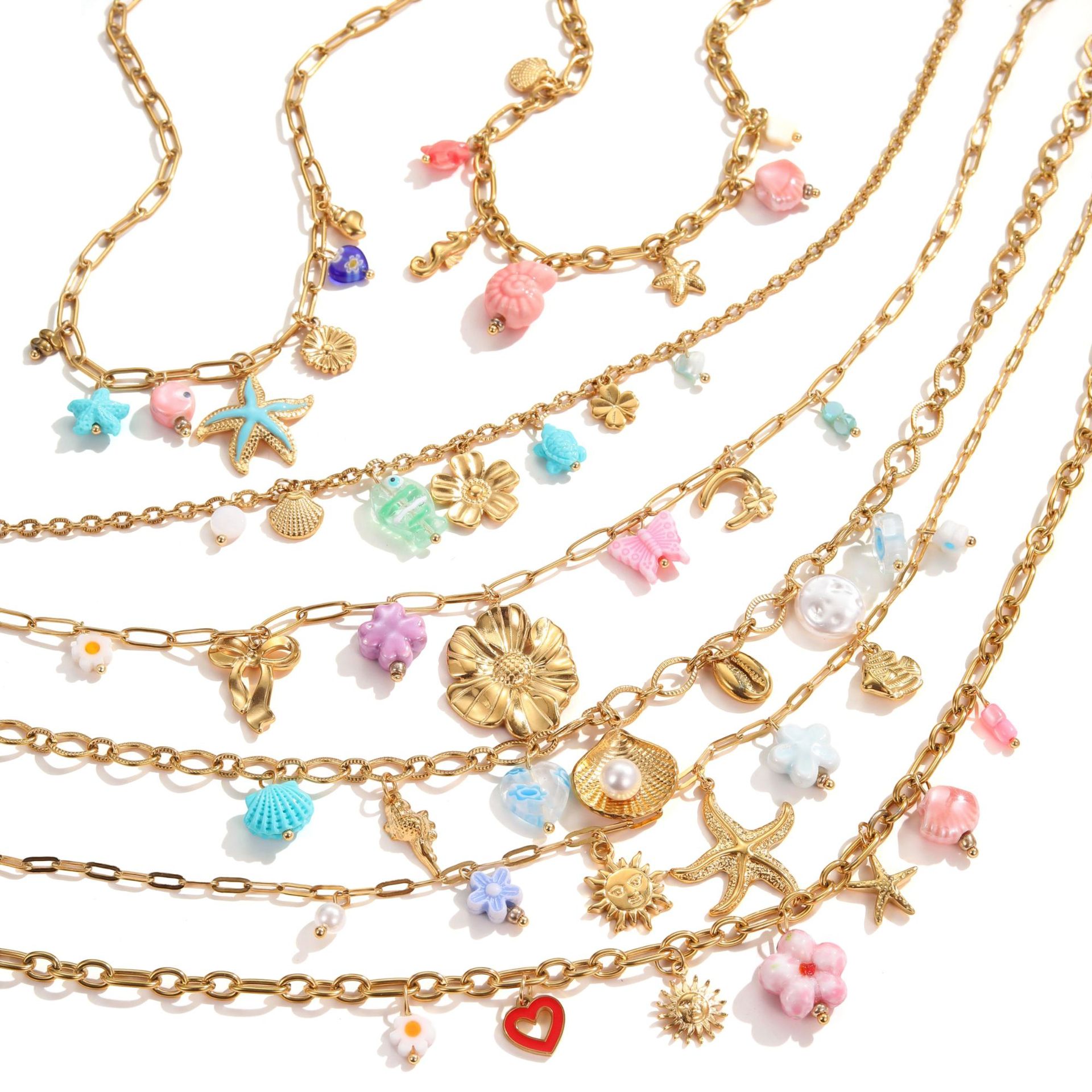 批发不锈钢18k镀金夏季沙滩贝壳珍珠防水首饰项链