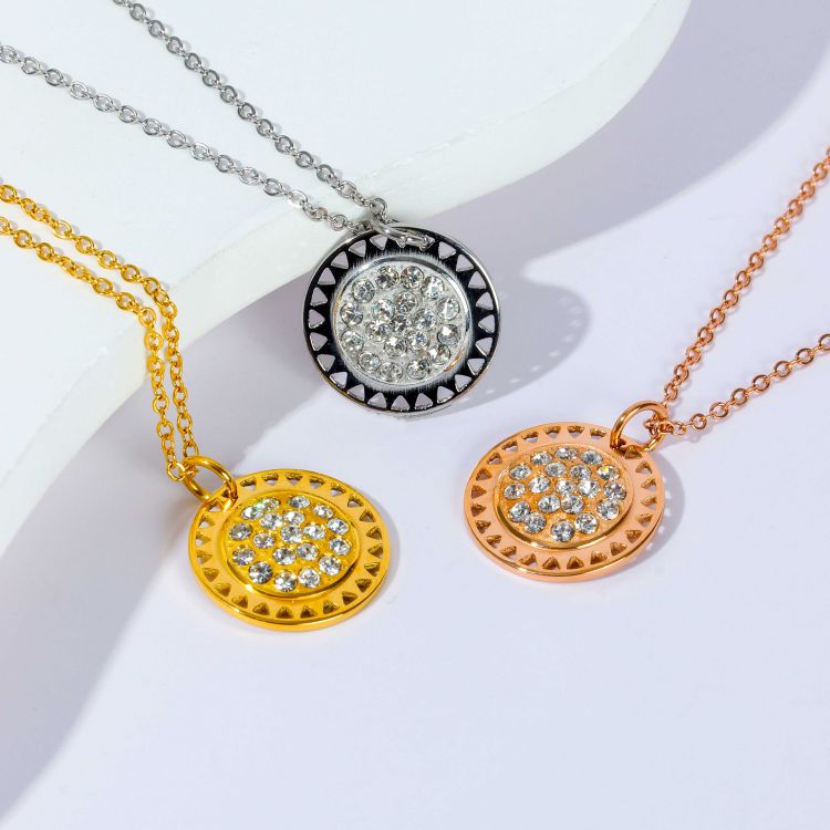 "三色圆形镂空镶钻玫瑰金不锈钢项链"